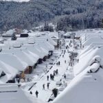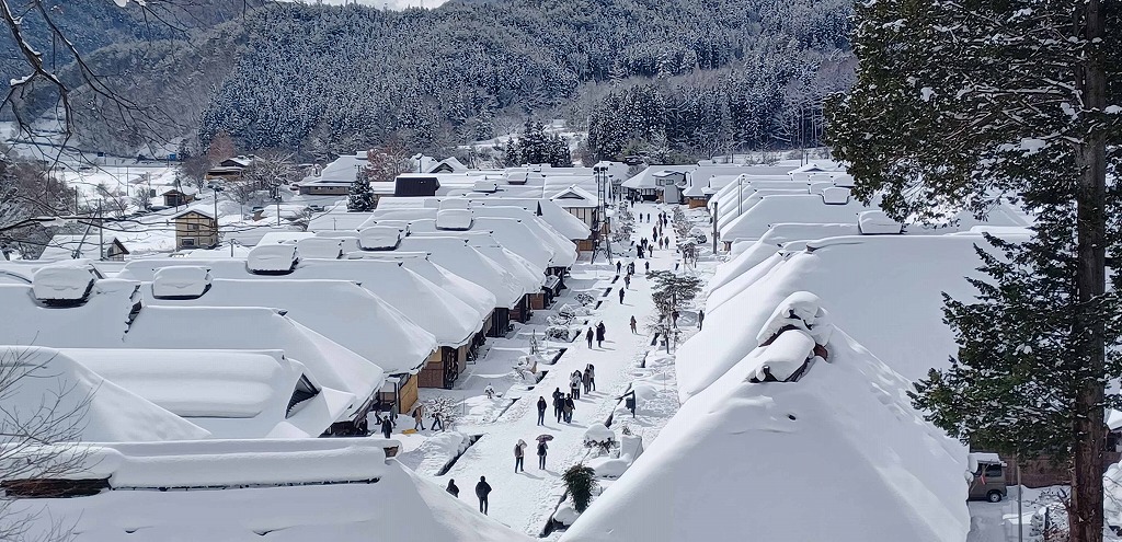 雪の大内宿(福島県下郷町)。台湾からの団体客がいっぱい。