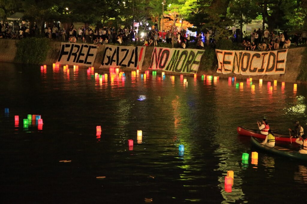 毎年この時期通う広島です。灯ろう流しの行われた元安川にこんなメッセージがありました。