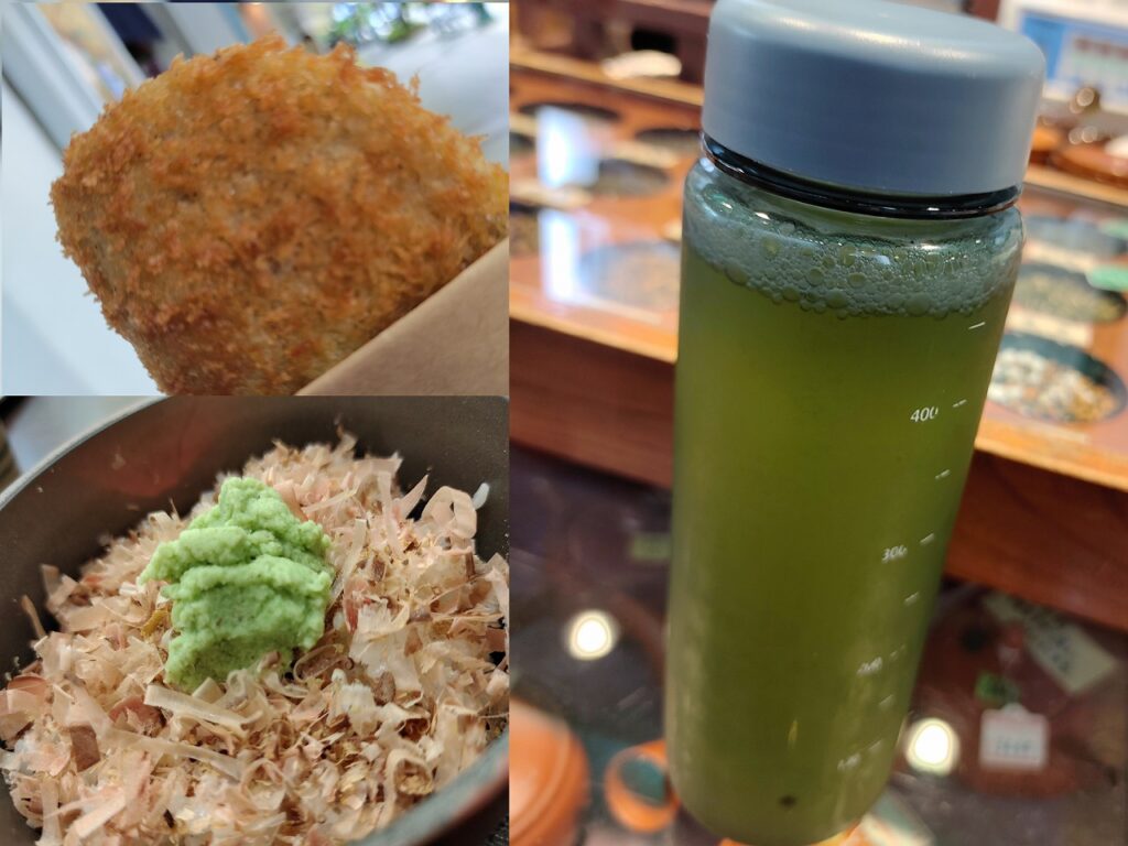 ほんだおすすめ「静岡市グルメ」は、静岡駅から徒歩3分・わさびの老舗(明治8年)「田丸屋本店」のわさび丼700円→→→徒歩30秒・練り物老舗(明治22年)「蒲菊本店」で黒はんぺんのフライ1枚170円→→→徒歩15秒・お茶の老舗(慶応元年)「小山園」の給茶スポットへ。マイボトルを持参し、めちゃ美味しい静岡茶100円。