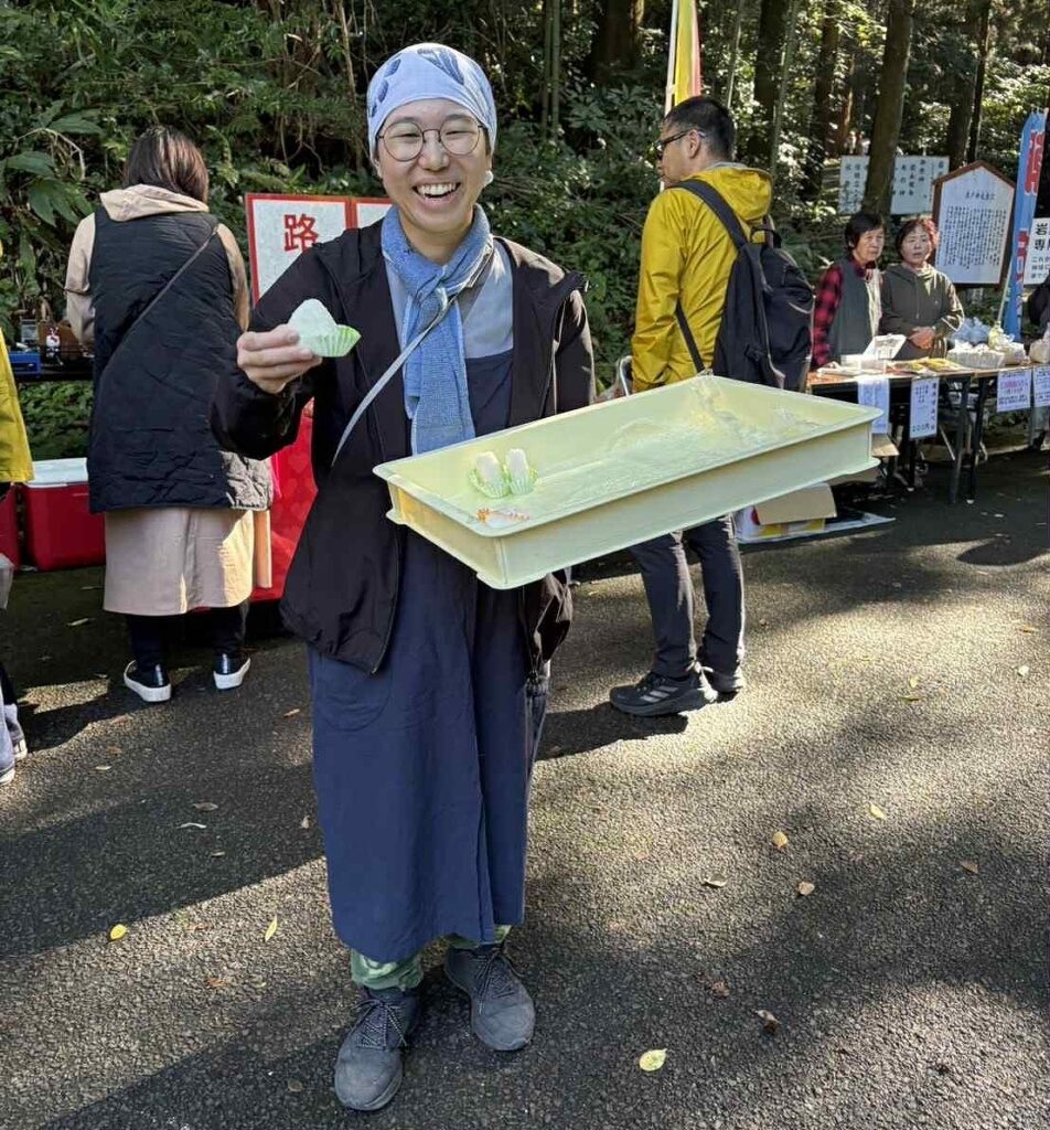 *写真は地元の新米おにぎりの試食を手伝う筆者。