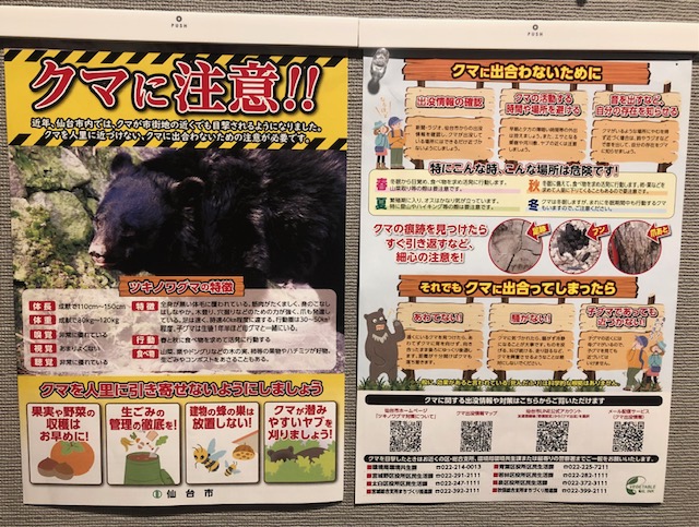 熊の写真が目を惹く、真っ赤な大文字で書かれた熊出没への注意喚起の仙台市からのチラシが、自宅マンションの掲示板に貼られています。