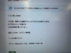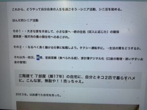 今までの家を売り、5坪の家を建て、果樹を植え、これからの仕事としてタクシードライバーを選び、さらに多彩な仕事をこなしながら、ほぼ毎日プールで泳ぐ。そんな行動的な日々で、一方、お孫さんもいるとか。とにかく面白い生き方です。皆が、こんごの参考として、自分事として聞き入りました。