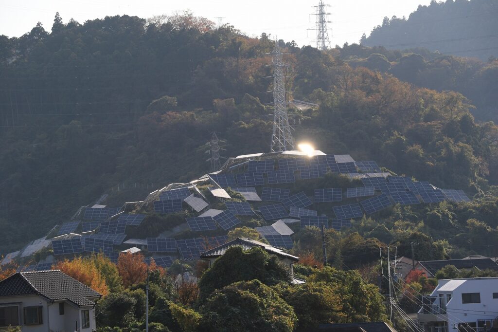 神奈川県横須賀市のメガソーラー。住宅地近くの山の頂に、乱雑に設置されたようなソーラーパネル。強風、大雨で大丈夫なのか?と思わず撮った。2025年11月撮影。